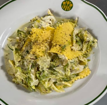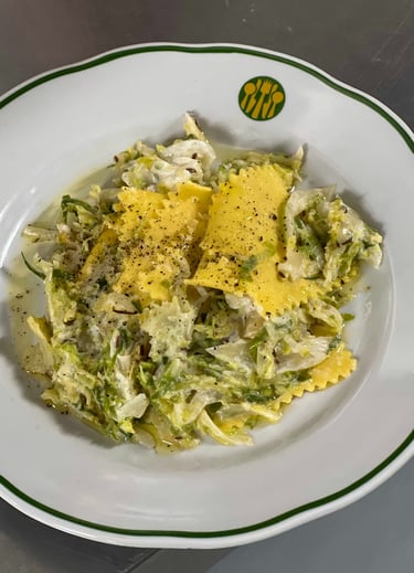 Home made Pasta with Brussels Sprouts, Caraway, Braised Onions and Sour Cream