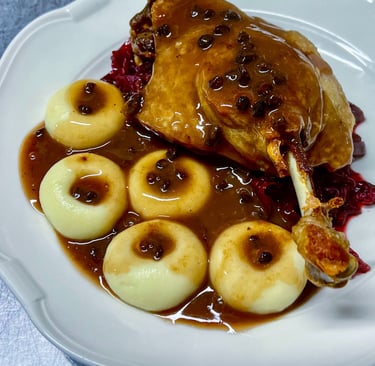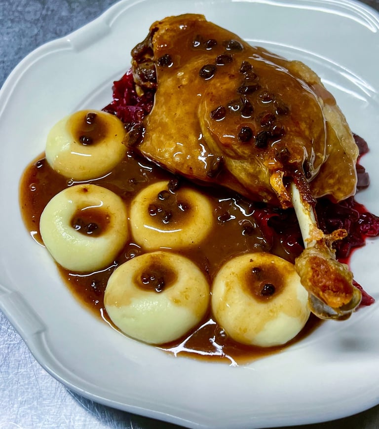Silesian Dumplings (Kluski Śląskie), Braised Red Cabbage, Black Currant Jus