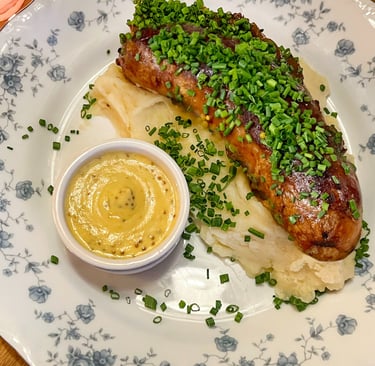 Kabanos, Caramelized Onion Barbeque, Creamy Slaw, Spicy Mustard, Crispy Potato Sticks, Pickle